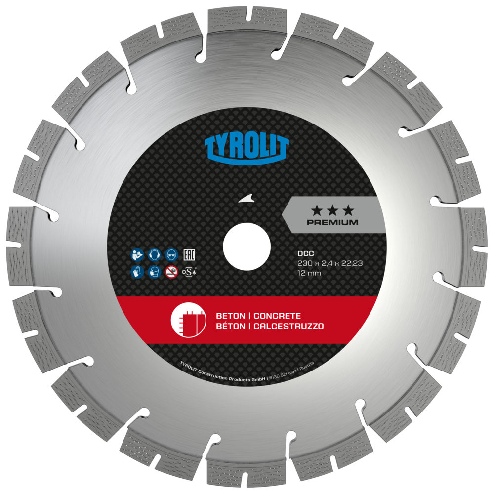 Discul are forma C73W, segmentii au o inaltime de la 10mm la 12mm si grosimi cuprinse intre 2.4mm si 2.6mm, cu diametre exterioare intre 115mm si 230mm pentru polizor unghiular si forma C73W, segmentii au o inaltime de 12mm si grosimi cuprinse intre 2.6mm si 3.2mm, cu diametre exterioare intre 300mm si 400mm pentru masina de taiat pe benzina.